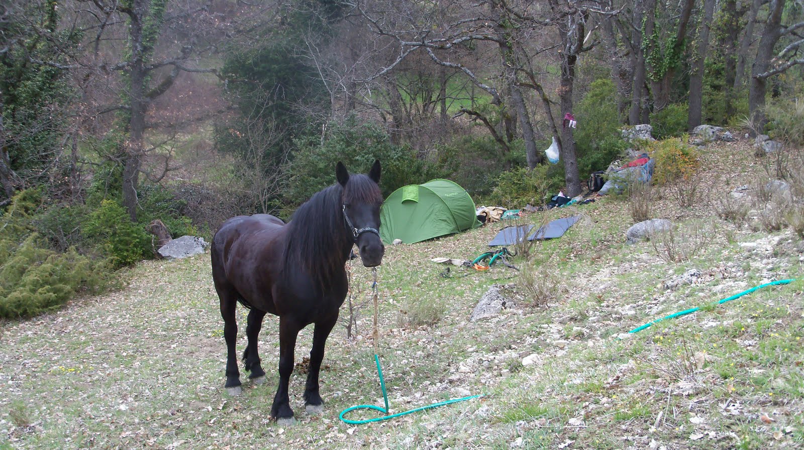 Yet another unforgettable day. Some main road at the outset, but after this a generally very pleasant climb into the mountains, surrounded by bluffs of rock. On the way we are stopped by a reporter from La Provence who takes pictures and tells us that we will be in next week's edition. Later, we give Nellie another therapeutic (and for the humans, freezing) 10 minutes in a river of barely melted ice-water, which she tolerates stoically. In the evening we camp next to the same river's much smaller and turbulent passage higher up and prepare a fire, until we discover that we have lost our matches. Without this, the picture would probably be too perfect.